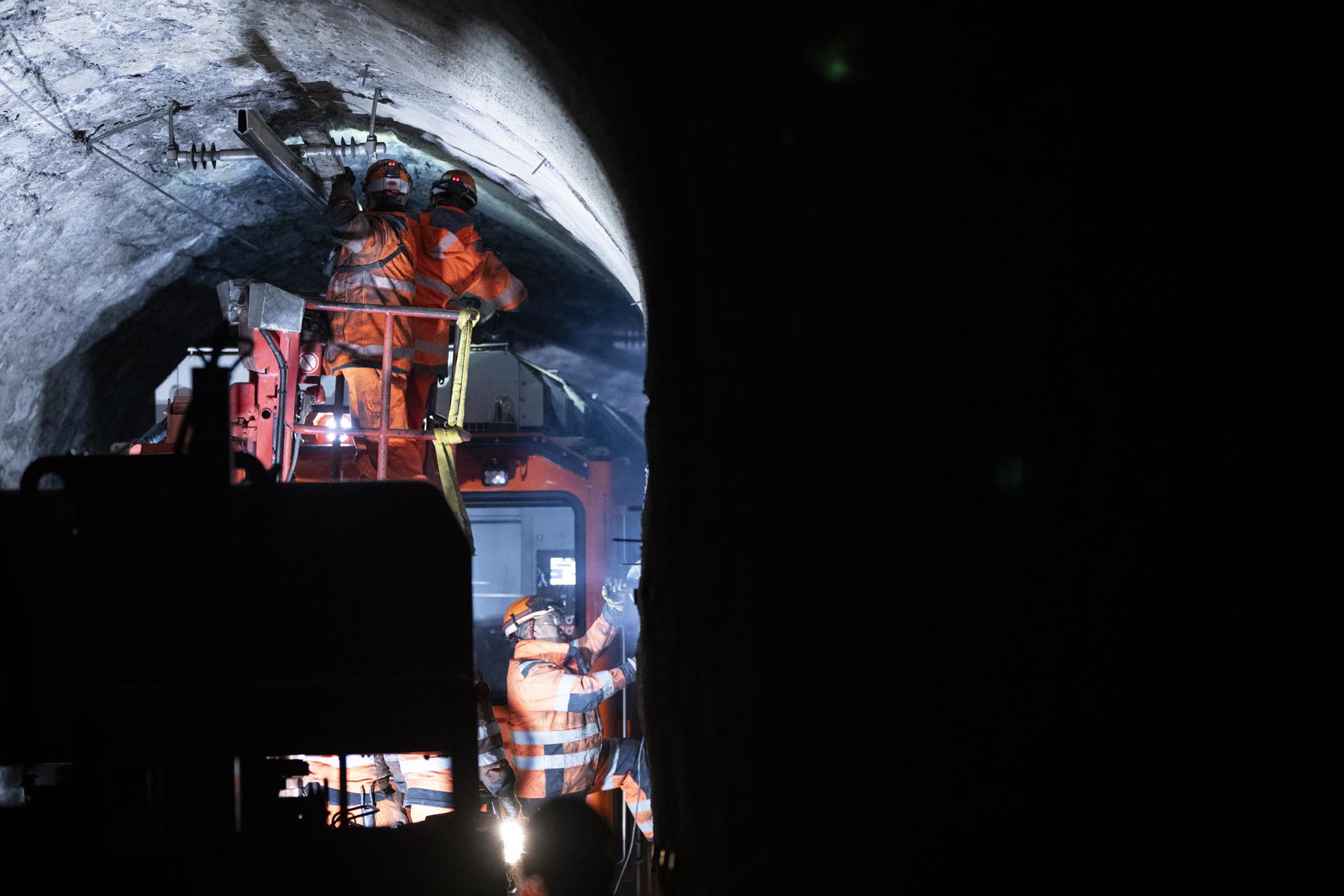En parallèle, la ligne de contact est retirée dans le tunnel, avant le démontage complet de la voie à l’intérieur de l’ouvrage.